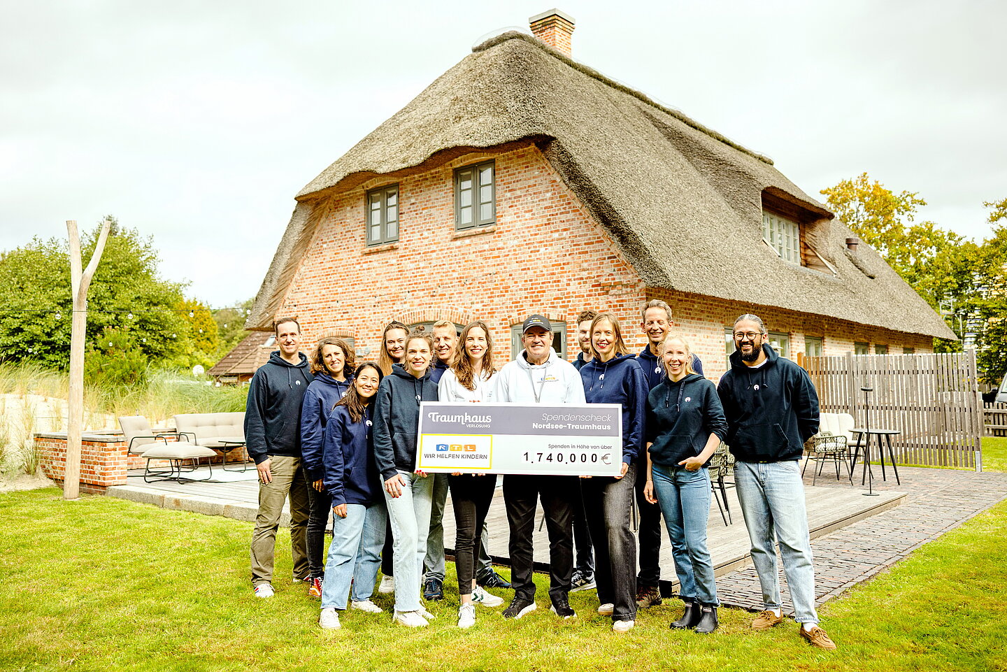 Wolfram Kons (Mitte) freut sich mit dem Team von Traumhausverlosung über den Rekorderlös von 1,7 Millionen Euro für die „Stiftung RTL – Wir helfen Kindern e.V.“. Foto: Traumhausverlosung.